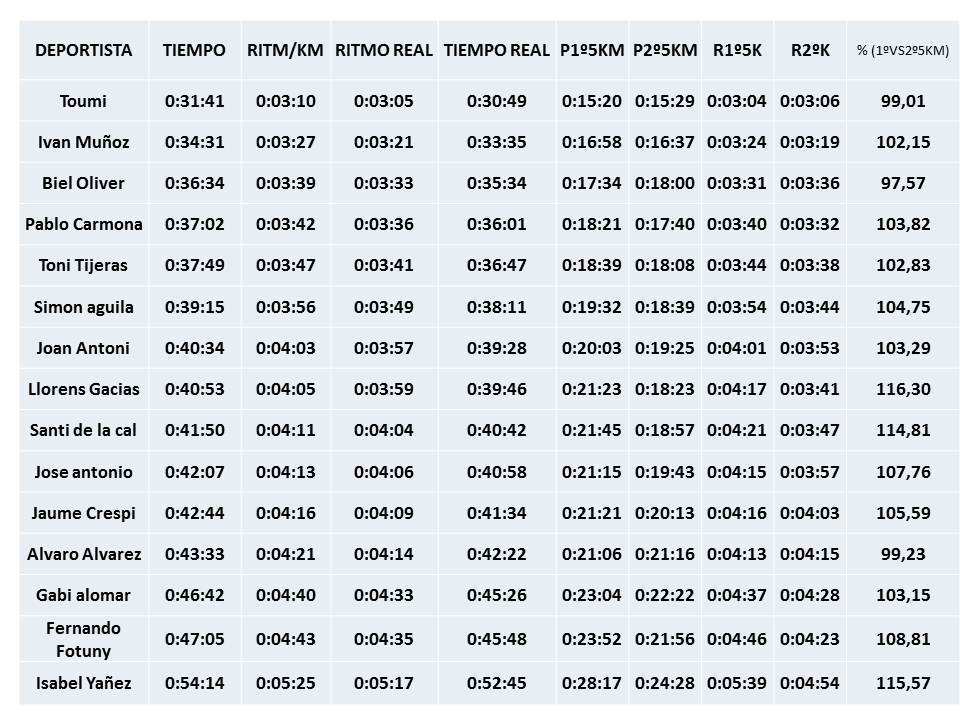 …15 fueron los pupilos que compitieron en los 10km, y los valores promedios de su rendimiento fueron los siguientes, demostrando el éxito de las sesiones de trabajo, y su traduccion inmediata a la competicion: