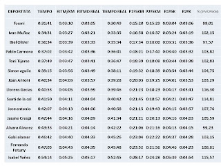 …los entrenamientos han dado sus frutos, no solo en forma de marcas, si no en el concepto de correr de forma progresiva, de menos a mas, sabiendo que se deben gastar los cartuchos al final, debiendo reservar al principio de la prueba(quizas en exceso), no obstante esta temporizacion de ritmo de prueba cada vez mas ajustada vendra dada por la experiencia cada vez mayor que se tendra al realizar este tipo de pruebas, como un 10mil, donde la sensacion de ir al limite para realizar nuestra marca personal debe existir practicamente durante toda la prueba, pero cuando nos enfrentamos a esta prueba en zonas supraumbral, es mejor siempre quedarse con la sensacion de poderse haber exprimido un poco mas, y acabar muy en progresion, quedando de este modo, un gran cartucho en la 1º mitad de prueba para siguientes ocasiones, y con la experiencia adquirida de ir al limite.