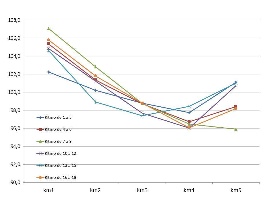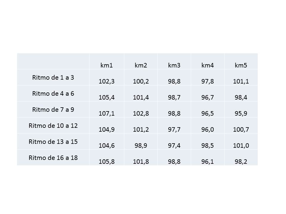 – Si analizamos el % de ritmo respecto del ritmo promedio final, por grupos de llgada de 3 en 3, 1º a 3º, 4º a 6º..etc…tambien observamos que los que mas rapido corren, es decir del 1º a 3º (ver arriba)son los que mas lentos salen respecto a su ritmo promedio, corriendo el 1ºkm solo un 2% superior a su promedio…y siendo capaz de acabar 1% mas rapido que su ritmo promedio, y lo mas importante, sin bajar en nungun km de casu un 98%!!!!mientras que el resto de grupos siempre tiene algun bajón critico por debajo del 96,5%! Tambien este grupo 1º a 3º es que mejor distribuye homegeneamente sus parciales