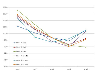 – Sacando el promedio de los Top 20 y su distribución del ritmo de carrera por km, llama la atencion que se sale el 1º km un 5% mas rapido del ritmo promedio al cual se acabara comenzando una caida en picado del ritmo, hasta el km 4 hacerlo casi 10% mas lento que el primero!!!!!algo pasa,y grave, el crisis fisiologica severa y es que el salir pasado de ritmo tarde o temprano se paga y en este caso analizando el promedio del top 20,solo se ha podido levantar el vuelo el ultimo km, rindiendo al 99%, del rirmo promedio.