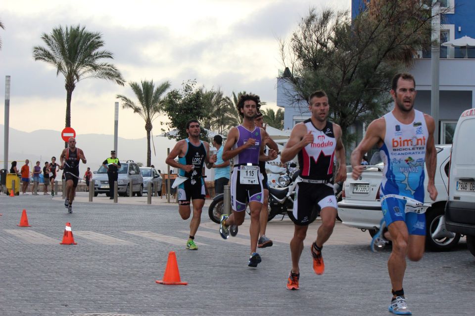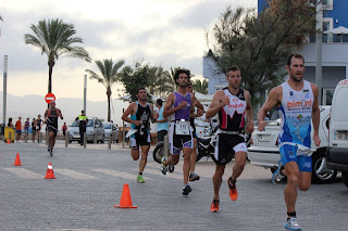..aqui en Mallorca , linea de salida, con Carlos Lopez, como gran favorito, yo sabia que disputarselo era realmente muy complicado, pero hariamos que hubiera que pelear, y asi fue sobre las distancias de 4km-900-4km, en el 1º segmento salida lanzada, y me dispuse a acelerar el ritmo, ya que cuanto mas fatigados se tiraran mis rivales al agua mejor, tan solo aguantan el ritmo, Dani Crespi, Andreu Marimon, y Carlos, ya antes de entrar a boxes, el ultimo km relajo un poco par anadar mejor, y entran con 10” de ventaja sobre mi, que al tocar la arena de la playa en el box, ya lo habia recuperado, tras haber corrido a menos de 3’20”km, tocaba nadar, y hasta la 1º boya mantengo ritmo de Carlos, pero de boya a boya, ya imposible, destacando éste como uno de los mejores nadadores nacionales de triatlon, y lo pone en evidencia.