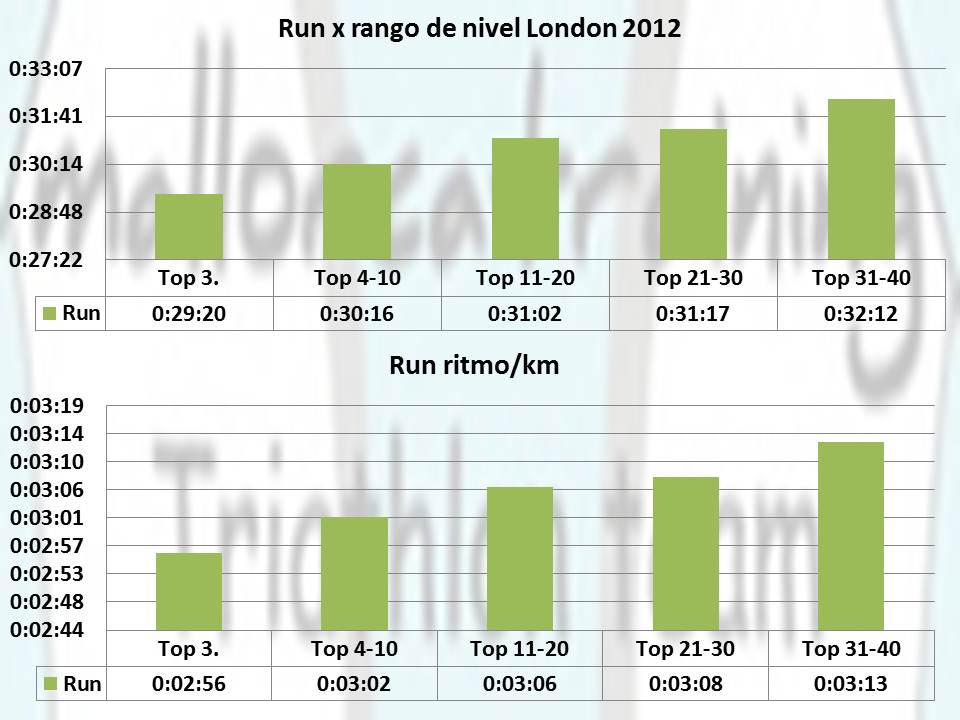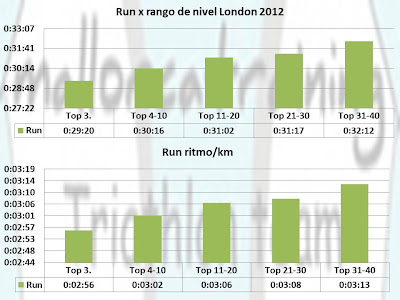 …para optar a medalla, correr en 29’20”!!!! a 2’56”km de promedio, algo realmente estratosferico, y mas despues de una segmento ciclista rapido. Del 4 a 10 , se debe poder correr en torno a 30’16”, a 3’02” aproximadamente con los que es un cambio de nivel acusado de mas de 6” por km! Vuelve a existir otro gran salto de nivel de 11 a 20, al promediar 31’02”, lo que supone correr a 3’06”, y posteriormente hay una establizacion de ritmos entorno a 31′, y ya del 30 hacia atrás hasta el 40 el rendimiento cae en 32’12, o lo que es correr a 3’13”/km que no esta mal, pero es que la diferencia con los puestos cabeceros es abismal, de casi 20” mas rapido por km!