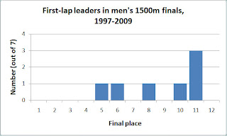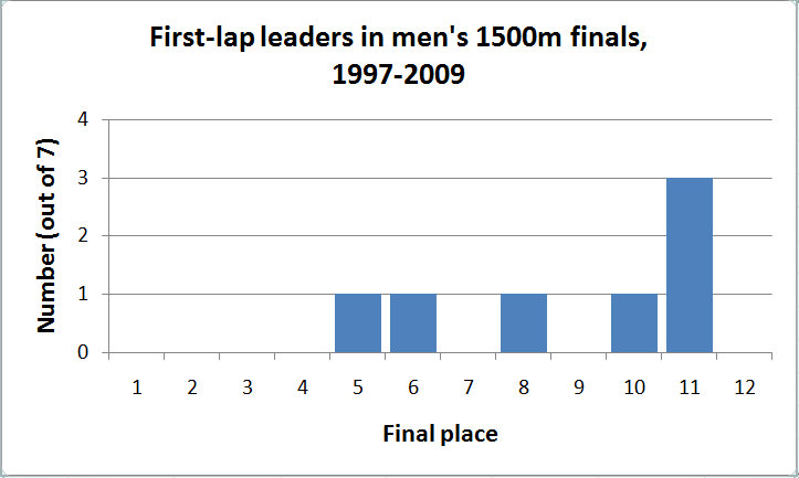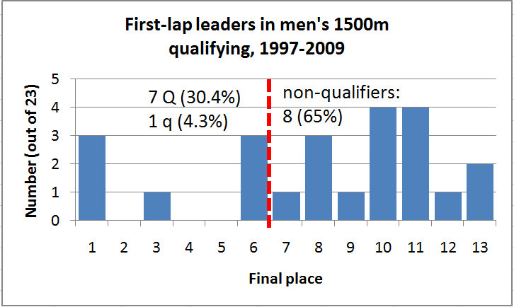 ..en los Ctos del mundo de 1500m, desde que se tiene constancia de los pasos intermedios(400-800-1200..)1997, hasta la fecha, se han disputado 23 eliminatorias de cuartos de final, y atención al dato, de aquellos atletas que lideraban la prueba al paso por la 1º vuelta, un 65% no paso de ronda!!!!Pero ahora viene el dato mas relevante, y es que en las 7 finales que se han disputado desde entonces , ningun atleta de los que ha liderado la prueba en la primera vuelta ha hecho podium!!!con lo que queda claro el efecto del drafting en la carrera a pie, a velocidades de VAM, y los beneficios que supone el ir “escondido..”, viendo que el mejor resultado de aquel que “tirado” la 1º vuelta ha sido de un 5ª!!!!