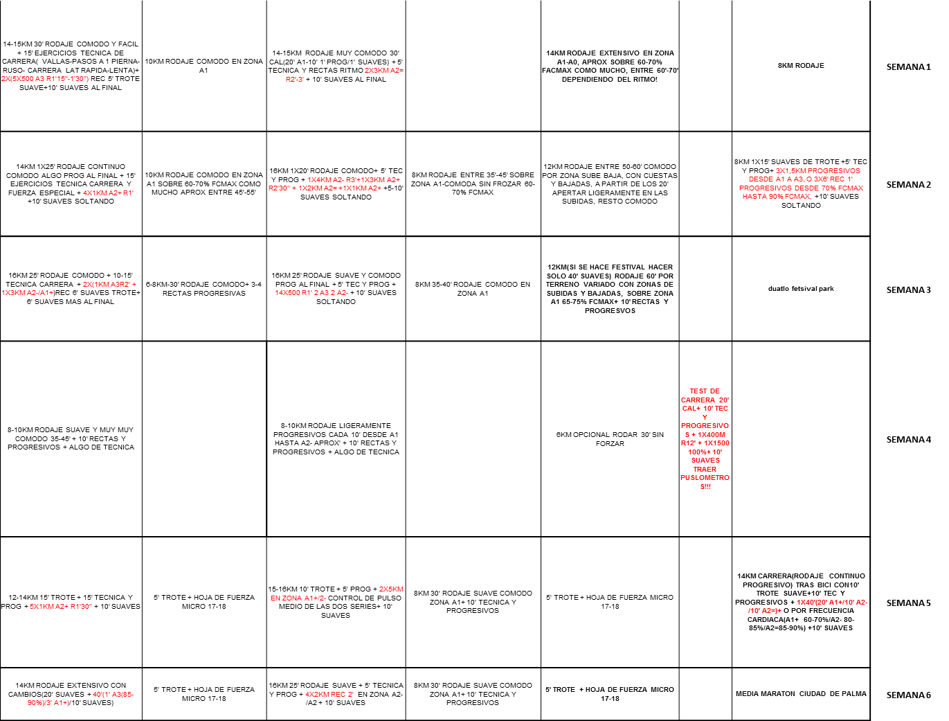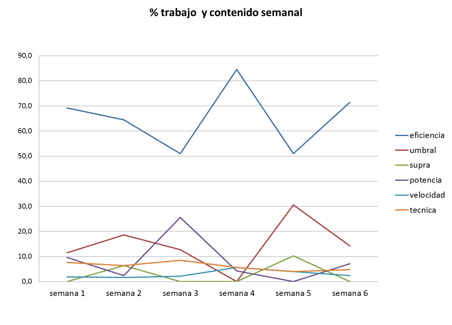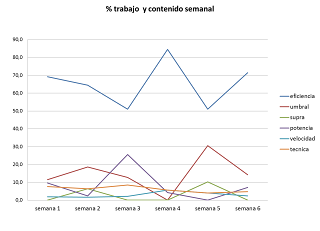 Si nos fijamos arriba, podemos observar el % de trabajo dedicado semanalmente a los diferentes contenidos(resumidos) de objetivos en carrera, como eficiencia, umbral, supraumbral,potencia aerobica,velocidad y tecnica. Lo mas destacable de la dinamica de contenido de las cargas es que duarnte las 3 primeras semanas sobre el 15-20% del trabajo estuvo enfocado al trabajo de la zona umbral o subumbral(ritmo media), para asimilarlo en la 4º semana, y valorarlo(test de difcits), y realizar una carga especifica en la 5º semana entre 12 y 8 dias previos de un 30% del volumen de la carga dedicado a este metabolismo, asi como un aumento en la 3º semana del trabajo en zona de potencia aerobica(ritmos de a3)cercanos a ritmo de 5km, para mantener, el trabajo que se habia hecho a principio de temporada. y a parte se realizo de forma permanente un 8-10% semanal de tecnica, con ejercicios especificos y de un 3-4% velocidad, con trabajos progresivos y regresivos casi maximales o sobre mpla(maxima potencia lactica), sobre todo tras los rodajes en zona a1, y tras los trabajos de tecnica.