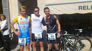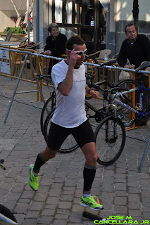 ..la prueba constaba de 5 vueltas de 5km, 3 vueltas de ciclismo de 7km y 2 km mas finales, en la 1º carrera, ya en el 1º km se formo un grupo donde ibamos 5, con Fidalgo, quien salió a entrenar y prefirio rodar comodo con nosotros, Juanan, Biel,yo y Paco Ruiz, que lo hacia por relevos, el ritmo fue vivo toda la carrera y en un circuito duro marcamos un crono de 16’40”, en la ultima vuelta cambie el ritmo para probar, a pesar de que no tuve buenas sensaciones, pero siempre hay que tantear, y a este cam,bio le siguio uno de Biel, para entrar en box, 1º Biel, 2º Fidalgo 3º yo y 4º juanan y 5º Paco Ruiz, ya en el box, salgo 1º con la bici, pero nos juntamos en seguida y nos vamos en bici 4, Juanan,que iba alternando algun palo, con tirar, Fidalgo, quien fue todo el rato a 10 metros por detras, y Mario(relevo de Paco).