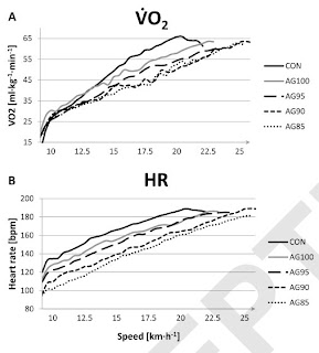 …esta claro que el peso es un factor clave en la velocidad, pero en que medida puede afectar , pues es curiosa la relación, ya que con una disminucion del 5% del peso corporal nuestra Velocidad Vo2max, mejora un 9,2 %, una barbaridad, pero ojo dedemos tener en cuenta que esta via de perdida de peso momentanea sólo no tiene una perdida de fuerza de nuestro tren propulsor, por que una perdida de un % de nuestro peso es igualdad de condiciones de entrenamiento, posiblemente mejorara nuestro rendimiento, pero no en ese 9%, quizas algo menos.