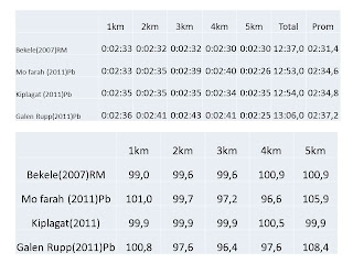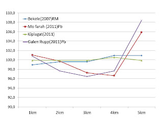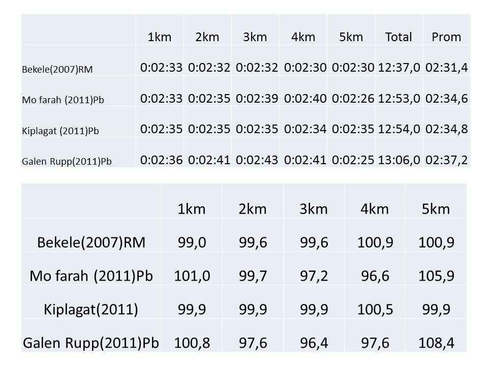 …cojiendo como ejemplo el record del mundo de Bekele en Hengelo de 12’37”, y 3 de las mejores marcas del año, como el 12’53” de Mo Farah, el 12’54” de Kiplagat, y 13’06” de Galen Rupp,que han sido sus mejores marcas, es decir nunca habian corrido tan rapido, lo 1º que vemos es que el ultimo km, en todos los casos es mas rapido o igual que el 1º km.. llamando la atenciión el km de Mo farah, 106% sobre el ritmo promedio, acabando en 2’26”, y Galen Rapp, acabando un 108% respecto ritmo promedio, en 2’25”,lo que significa que podrian haber ido algo mas rapido, habiendo distribuido el esfuerzo en los otros 3km…y el primer km en ninguno de los casos es superiro al 101% del ritmo promedio, mientras que en la entrada anterior veiamos como el promedio de los top 20, comenzaba a un 105% de su ritmo promedio(algo pasados, como se puede obervar segun los datos actuales)..