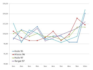 …habiamos hablado en el anterior post de que los que mejor regulan son los 1ºs, y es que los que acaban en puestos de honor pero no delanteros, se van abducidos por los ritmos inciales de cabeza y luego sobrevenienen las explosiones fisiologicas, en forma de severa depresion en el ritmo final de prueba, cruzando meta, en circunstancias limites…