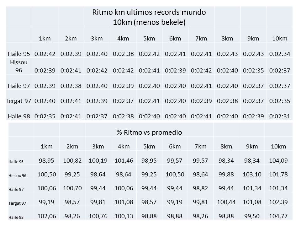 ..los ritmos distribucion en 10km, son si cabe mucho mas homegeneos, estando por ejemplo en los ultimos 5 records de mundo del 10km, (excepto bekele),y con una particularidad, en todos el ultimo 5km es mas rapido que el 1º, se corre en negativo, sobre todo gracias a un gran 2mil final….bastante por encima del ritmo promedio de la prueba tambien, y en ningun momento la perdida de rimto respecto al promedio cae mas alla del 98%!!!!!es decir hay que ser un reloj en los parciales practicamente y tener muy claro el ritmo de carrera…