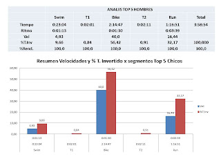 Y el ganador Raelert claramente gano la prueba en la carrera a pie, donde a pesar del nivel de la misma, logro correr un 7%mas que el promedio de top 5!!!! a un promedio de 3’24”/km la media maraton, tras 90km a casi 40km/h de media,y con un puerto de montaña, algo soberbio!!!!
